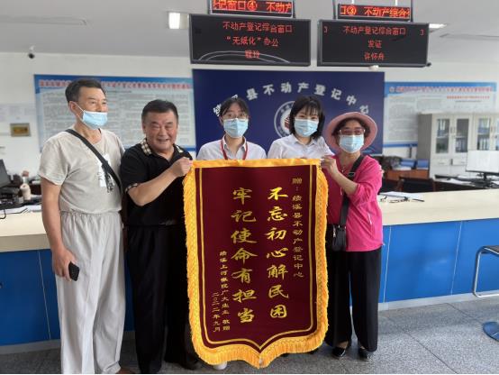 “非常感謝你們,這段時間里,你們不厭其煩的為我們解答問題,不停的到開發商、相關單位去協調溝通,讓我們的問題圓滿解決。近日,上河徽苑小區的業主代表為縣自規局不動產綜合窗口送上了一面印有“不忘初心解民困,牢記使命有擔當”的錦旗,并表示感謝。