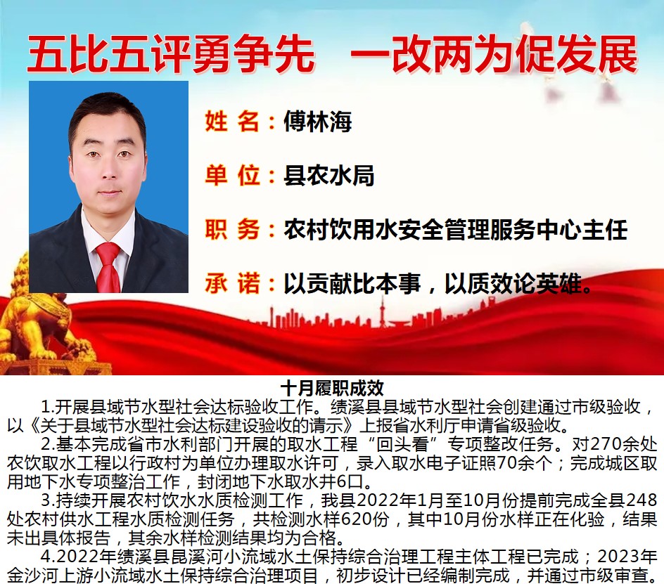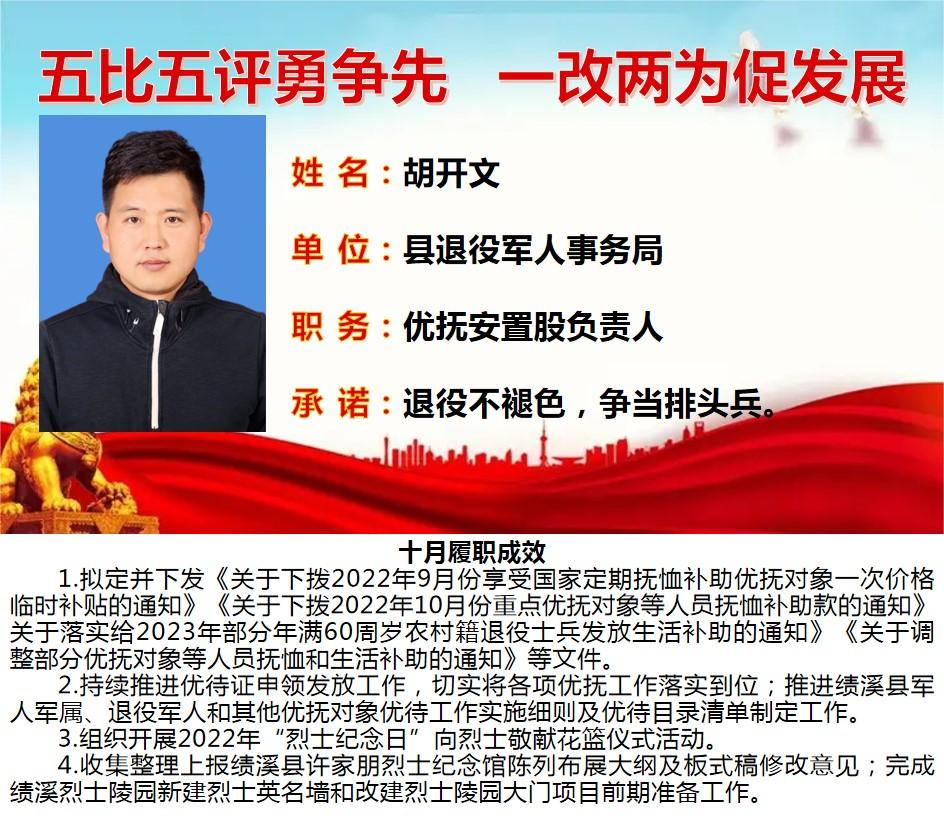 為深入學習貫徹習近平總書記關于作風建設重要論述、落實省委“一改兩為五做到”要求,著力解決個別干部作風中“虛、躲、冷、粗、假”等頑瘴痼疾,我縣組織開展了縣直單位百名股長“五比五評”活動。根據活動《實施方案》要求,現將2022年度100名參評對象10月份履職成效分期進行公示。